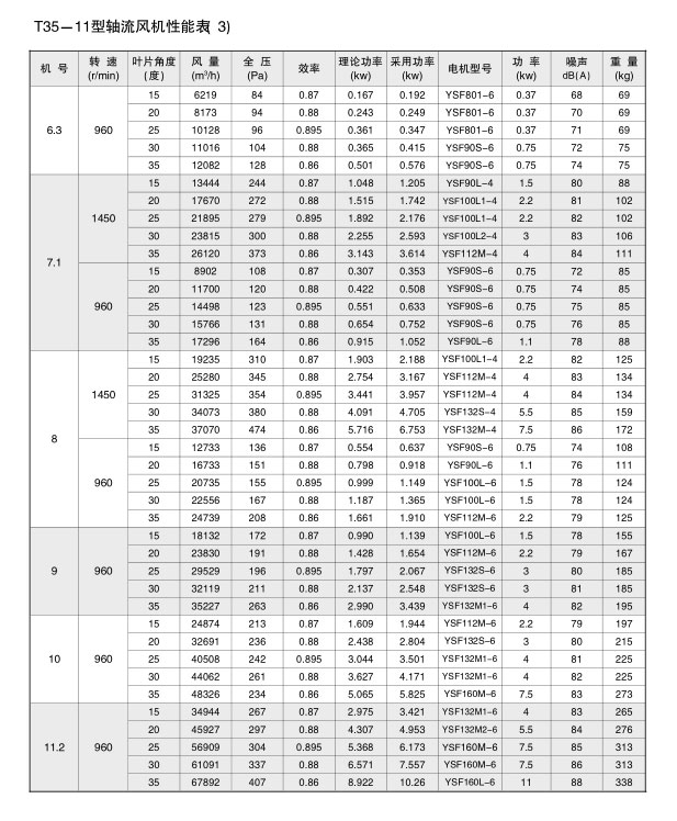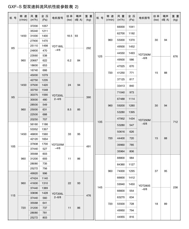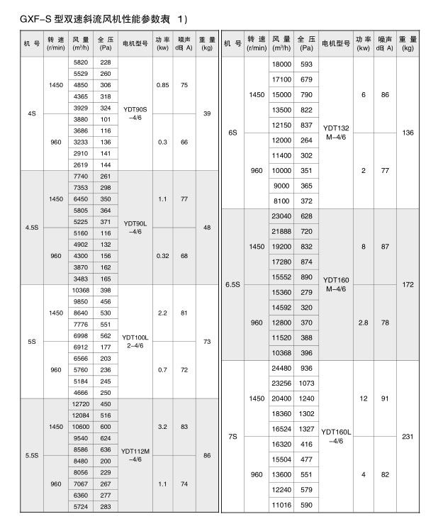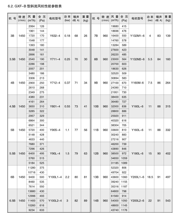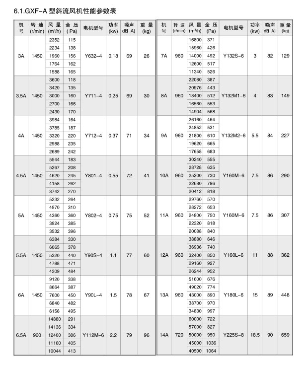 GXF系列斜流通風(fēng)機(jī)按葉輪直徑分為400-1400mm十四規(guī)格,按類型分為A、B、C、S四種類型,共五十八個機(jī)號。風(fēng)量由3000-90000m3/h,全壓由185-2500Pa;這樣就給設(shè)計部門和用戶單位提供了充分的選擇條件,具體數(shù)據(jù)請查風(fēng)機(jī)性能參數(shù)表。